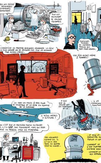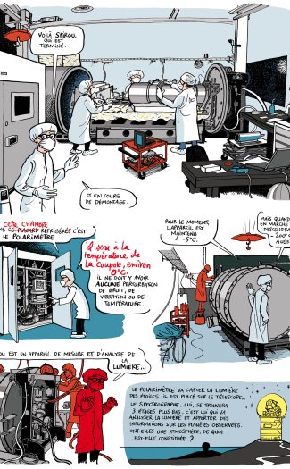 In a new 4-plate comic strip report, end 2017, journalist-cartoonist Jean-Yves Duhoo retraces the last phases of the SPIRou instrument’s alignment and its packing before being shipped and then installed at the Canada-France-Hawaii telescope in February 2018.