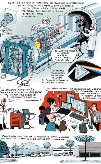 By clicking on the image, you can download this comic strip (in French), kindly made available to us by Jean-Yves Duhoo and the éditions Dupuis. . This comic strip was created by the artist / science reporter Jean-Yves Duhoo as part of the collaboration with the SPIROU magasine that will continue throughout the whole construction of SPIRou (starting mid 2014) until first light at CFHT (planned for 2017) and the many science breakthroughs expected from this novel instrument – in particular the discovery of new habitable worlds orbiting red dwarf stars in the neighborhood of our Solar System.